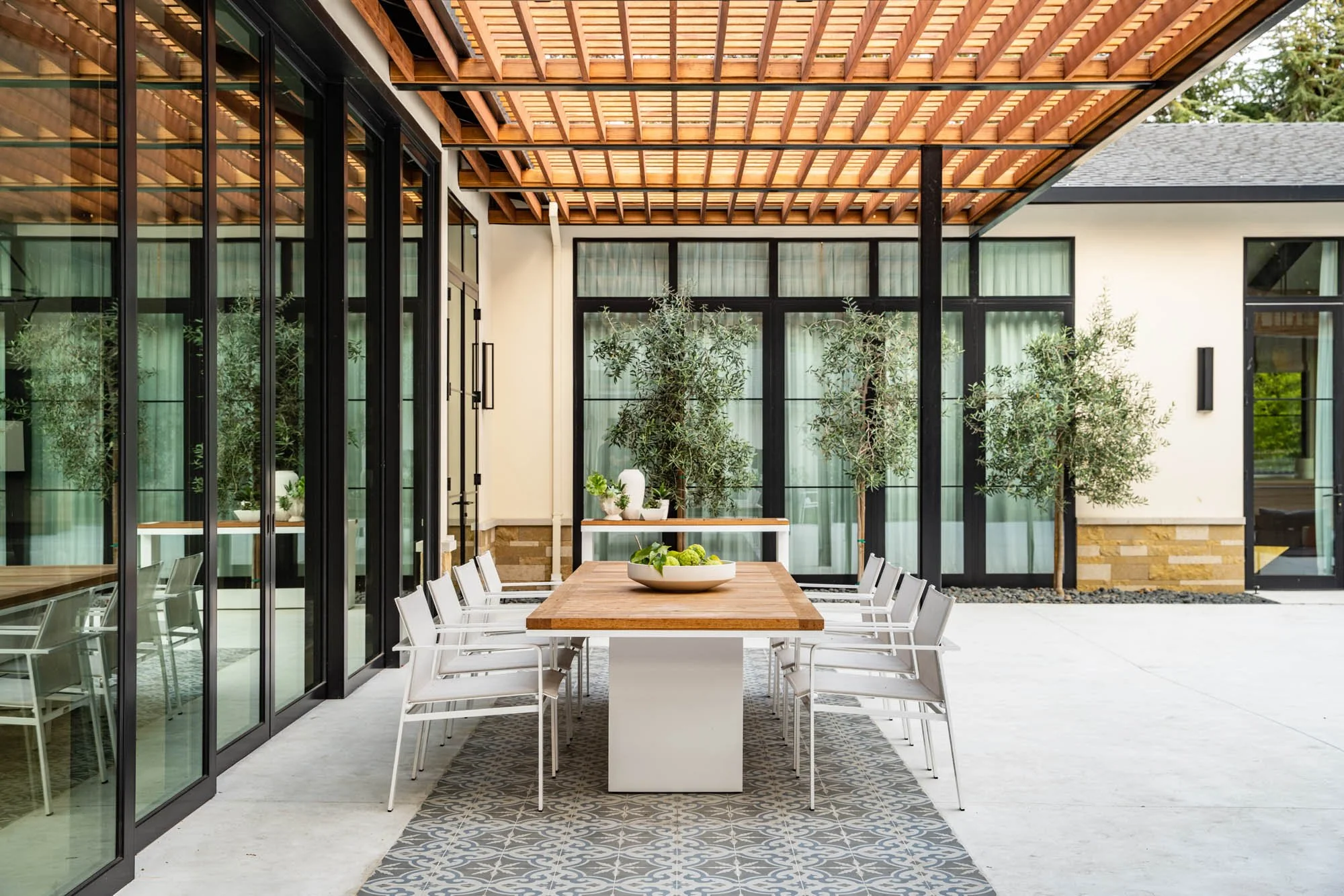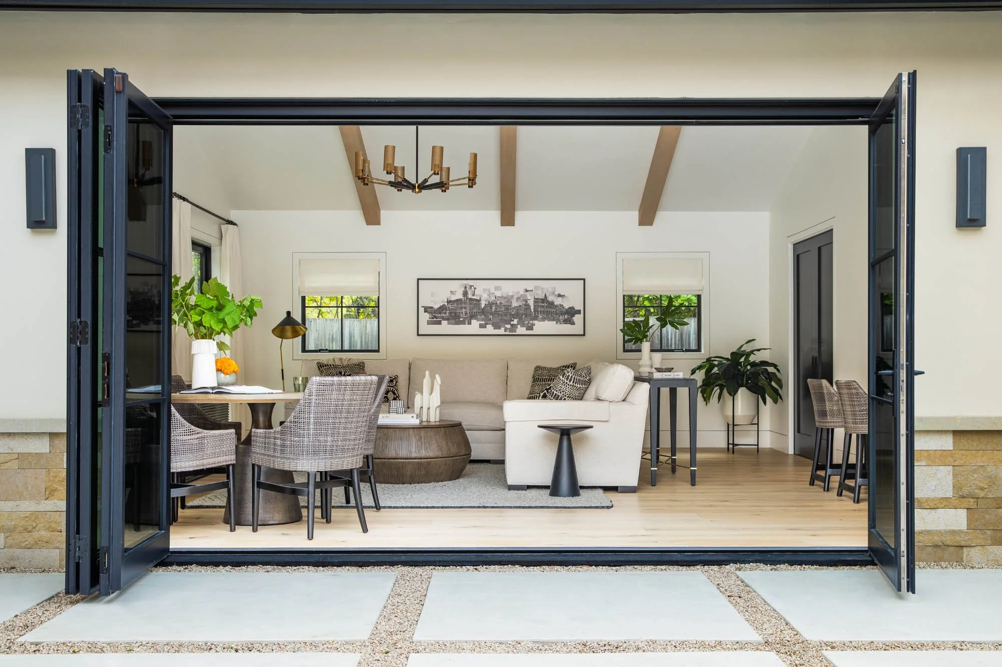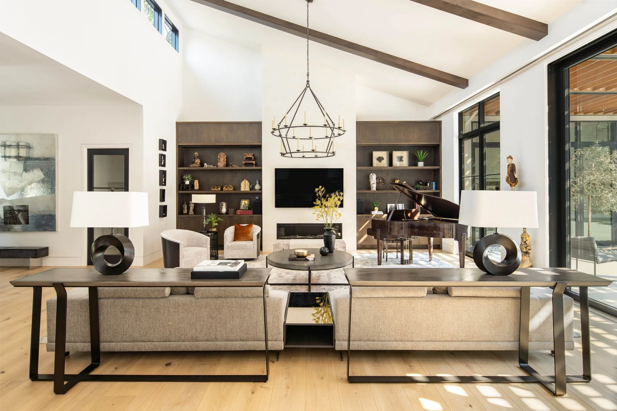 This home was a labor of love that spanned over 3 years of renovation. What started as a small remodel quickly turned into an entire estate, complete with a 1 Bedroom ADU, outdoor Kitchen, pool area and steel & glass enclosure coined the “Wellness Center” that features a gym on one side, and a steam shower/plant haven on the other. Antique Spanish doors provided by the client were incorporated into the design as their exterior gate & Office entrance. Custom furniture is sprinkled across the estate, along with high end finishes, and worldly décor as a homage to the client’s heritage.